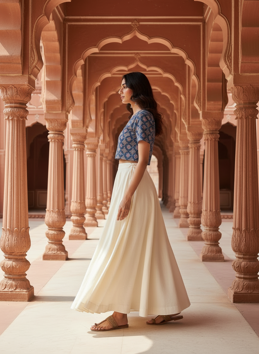 Ruhani is a moonlit twist on a classic crop top. Made in breathable cotton with hand-block prints from Jaipur, it pairs beautifully with high-waisted jeans, skirts, or saris for a true east-meets-west look. The cut is modern and flattering, while the print keeps it rooted in Indian craft.